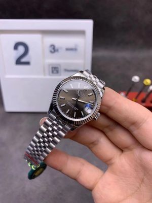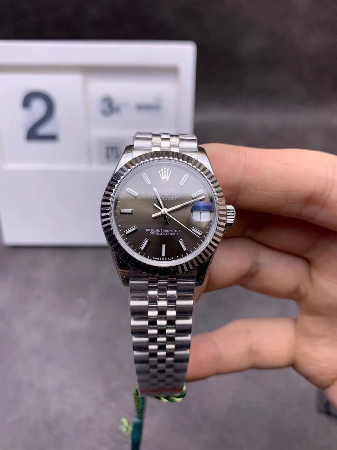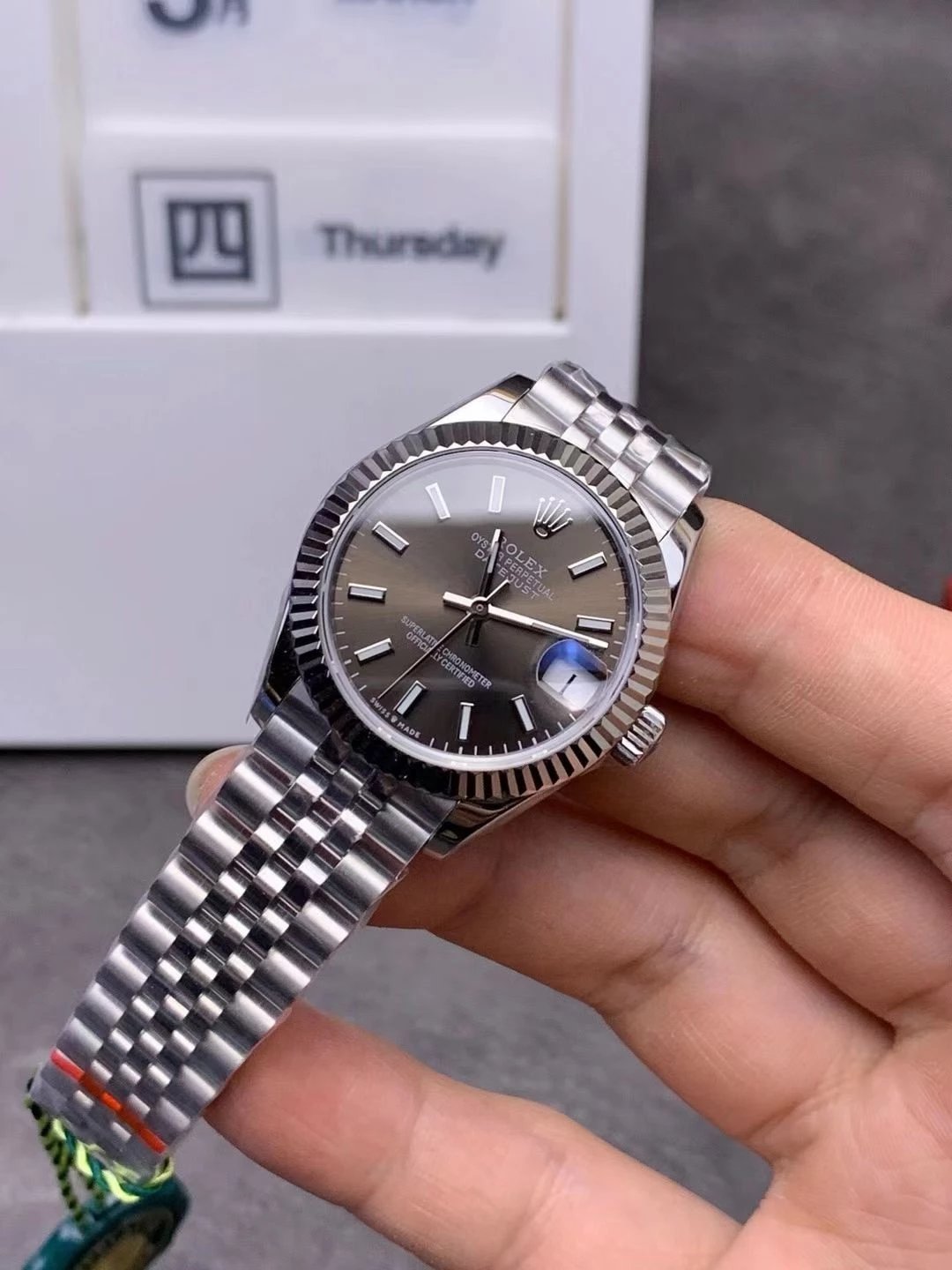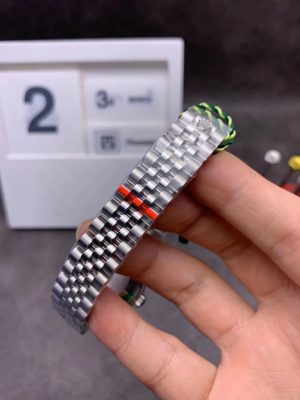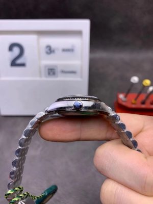 White gold bezel material, triangular pitted mirror material, scratch-resistant blue crystal, small window convex mirror magnifying calendar crown material, screw-in type, double lock double waterproof system, strap material, Oyster steel, commemorative type, five-lattice chain buckle material, Oyster style steel